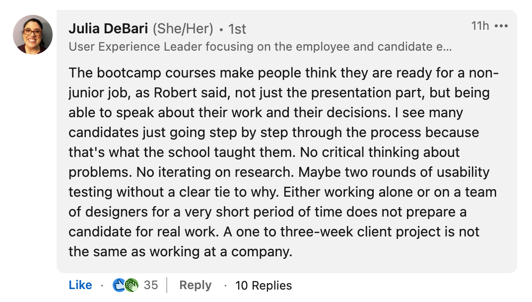 Both of these complex parts - soft skills and critical thinking skills - are probably more important than the knowledge you get in the bootcamp. This is what I think the hiring manager in the message you shared with me is speaking to. If someone has no real world experience with these two things, they’re only 1/3 effective in their role as a designer, and therefore not worth hiring in most hiring manager’s eyes.